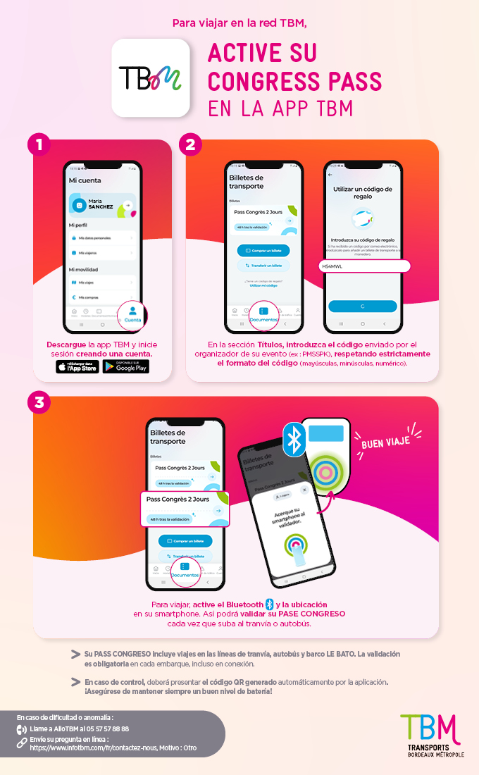 - Su PASS CONGRESO incluye viajes en las líneas de tranvía, autobús y transbordador fluvial BAT3. El periodo de validez de su PASS CONGRESO se indica en el momento de la entrega del código.
