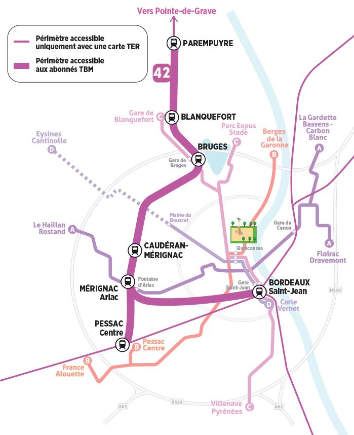 La ligne Ter 42 relie Bordeaux à la Pointe-de-Grave, dans le Médoc. Elle traverse les gares de Parempuyre, Blanquefort, Bruges, Caudéran Mérignac, Mérignac-Arlac, Pessac centre et Bordeaux Saint-Jean. A titre expérimental d'une durée d'un an à compter du 24/02/2020, les abonnés annuels, mensuels et hebdo TBM et TER+TBM, ont accès à la ligne 42 du TER entre Parempuyre et Pessac centre et entre Parempuyre et Bordeaux Saint-Jean.