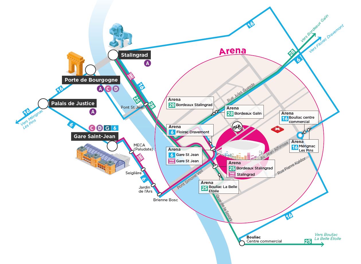 À l’occasion de concerts ou spectacles à Arkea Arena, TBM met en place la Navette Arena reliant le centre-ville de Bordeaux (Stalingrad et Gare Saint-Jean) à l'Arena.