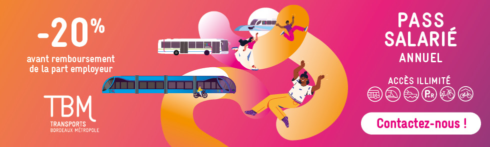 Vous pouvez bénéficier de -20% de remise sur le PASS annuel TBM. Pour vous abonner, rapprochez-vous de votre RÉFÉRENT PASS SALARIÉ ou du Service de Ressources Humaines !