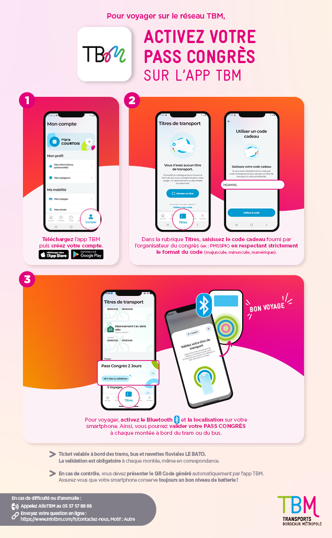 - Votre PASS CONGRES inclut des déplacements sur les lignes de tram, bus et navettes fluviales BAT3. La durée de validité de votre PASS CONGRES est indiquée à la remise du code.