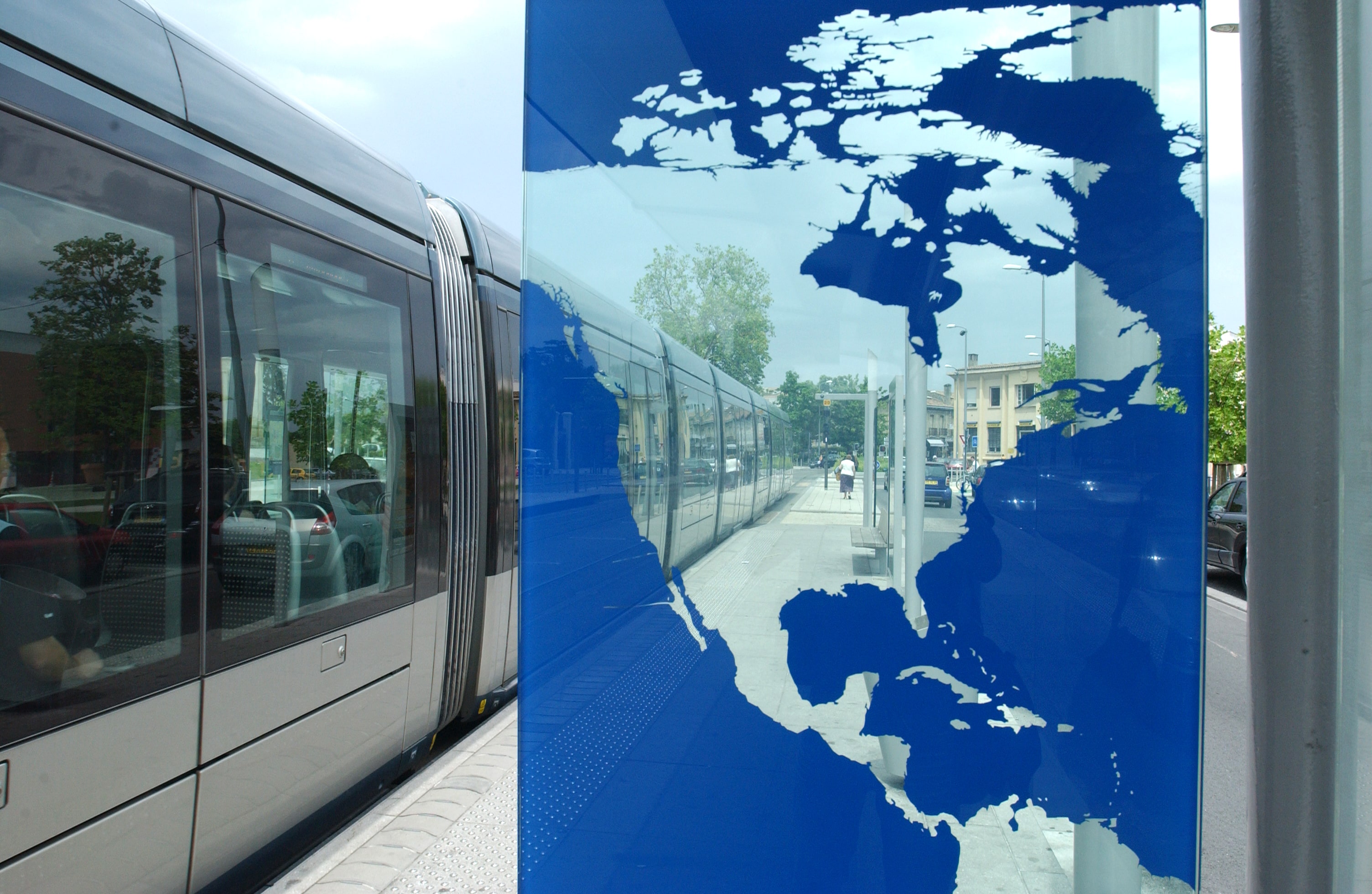 AUX BORD'EAUX – Stalker | 137 panneaux coupe-vent disséminés dans les stations du réseau tramway – 2003 Découvrir la ville à travers la silhouette des continents, telle est la proposition de ces panneaux coupe-vent créés par le collectif Stalker et Elizabeth de Portzamparc. Via un jeu de transparences, les mouvements des passants font interagir la carte du monde et le territoire immédiat, invitant à la rencontre et aux échanges. ©Bordeaux Métropole |