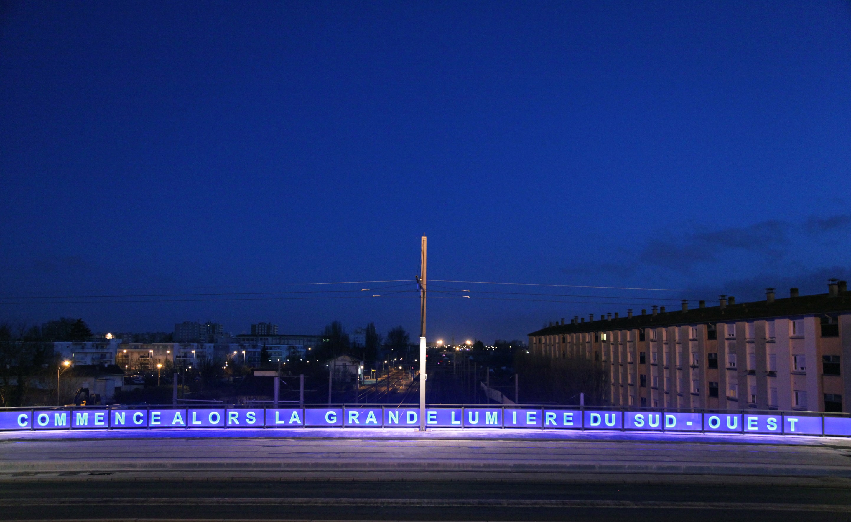 COMMENCE ALORS LA GRANDE LUMIÈRE DU SUD-OUEST - Pascal CONVERT | Bègles, Station Gare de Bègles, tramway ligne C – 2015 Sur le garde-corps du pont flotte une phrase simple, visible jour et nuit. La lumière est à la fois le message et le medium. Avec cette référence à Roland Barthes, l’artiste Pascal Convert convoque la mémoire de cette ancienne banlieue ouvrière de Bègles et rappelle le rôle joué par la littérature pendant la guerre, pour soutenir l’espoir lorsqu’il n’y en avait presque plus. ©P.Convert |
