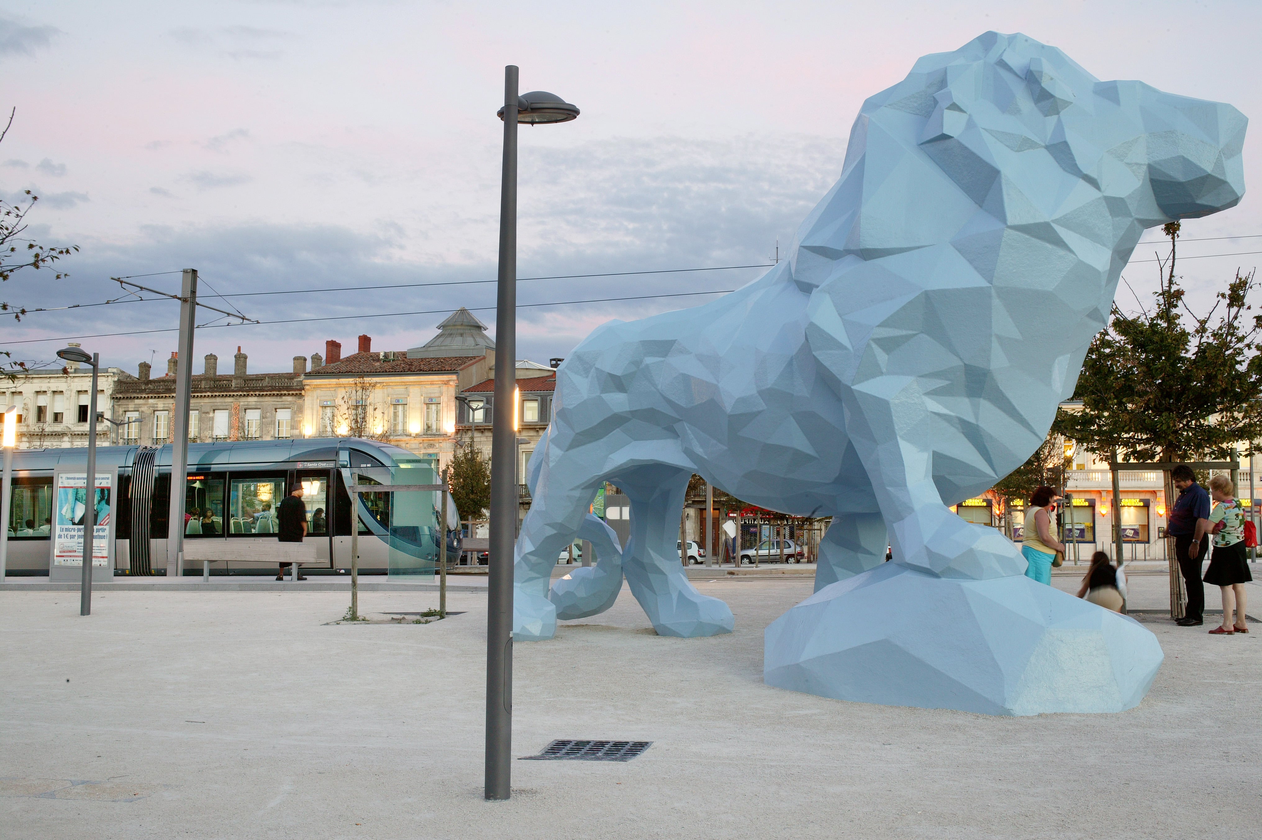 LE LION - Xavier VEILHAN | Bordeaux, Station Stalingrad, tramway ligne A – 2005 Un lion bleu empathique, irréel et surdimensionné se dresse sur la rive droite autrefois considérée comme à l’écart de la ville. Symbole de vaillance et de courage, le fier animal dessiné par Xavier Veilhan abrite les passants et joue le rôle d’emblème du quartier. Son aspect géométrique très contemporain bouscule et interroge les codes de la statuaire. ©R.Escher |