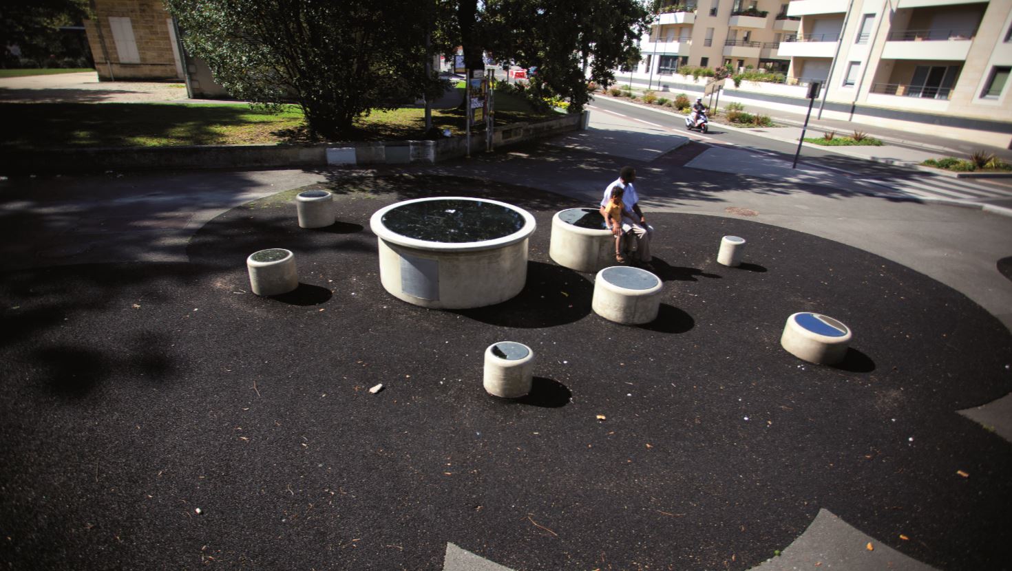 LE RÉCIT PERPÉTUEL - Melik OHANIAN | Talence, Station Peixotto, tramway ligne B – 2006 Ce drôle de mobilier urbain imaginé par Melik Ohanian est en réalité en une représentation insolite du cosmos. Les modules symbolisent notre système solaire, le soleil au centre et les planètes gravitant autour. Le plaques de verre qui les recouvrent sont gravées de mots du vocabulaire scientifique et laissent à chacun la possibilité de reconstituer son propre récit. ©Bordeaux Métropole |