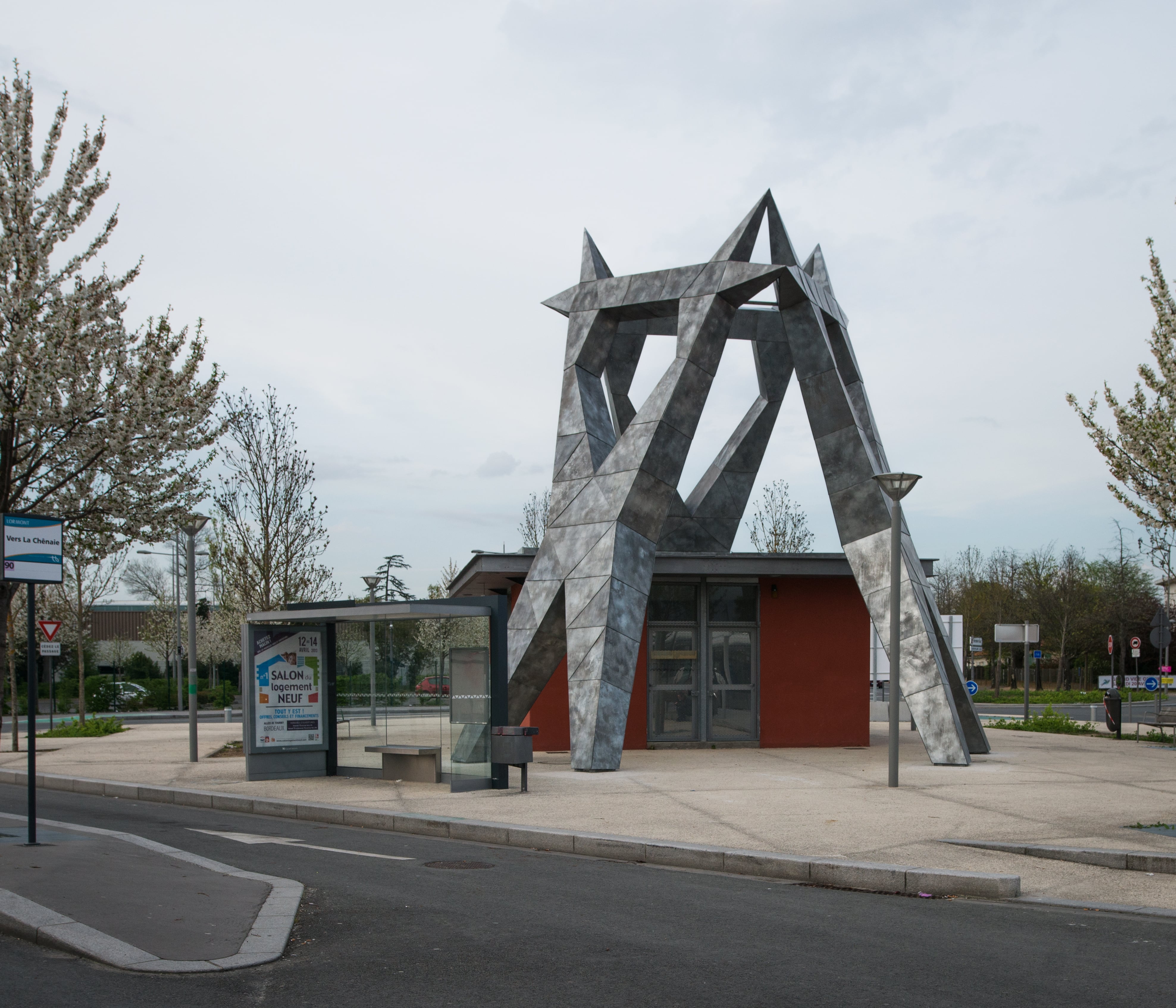 LES FÉES - Antoine DOROTTE | Bassens, Station La Gardette Bassens Carbon-Blanc, tramway ligne A – 2013 Au cœur de la station, trois silhouettes monumentales inspirées des pylônes de lignes à haute tension dansent une ronde électrique. Illuminé la nuit, ce totem métallique inquiétant et fascinant fait référence au patrimoine industriel des rives de l’estuaire. Cette œuvre d’Antoine Dorotte évoque l’angoisse et l’espérance que les mythes du progrès génèrent. © A.Leroy pour Bordeaux Métropole |