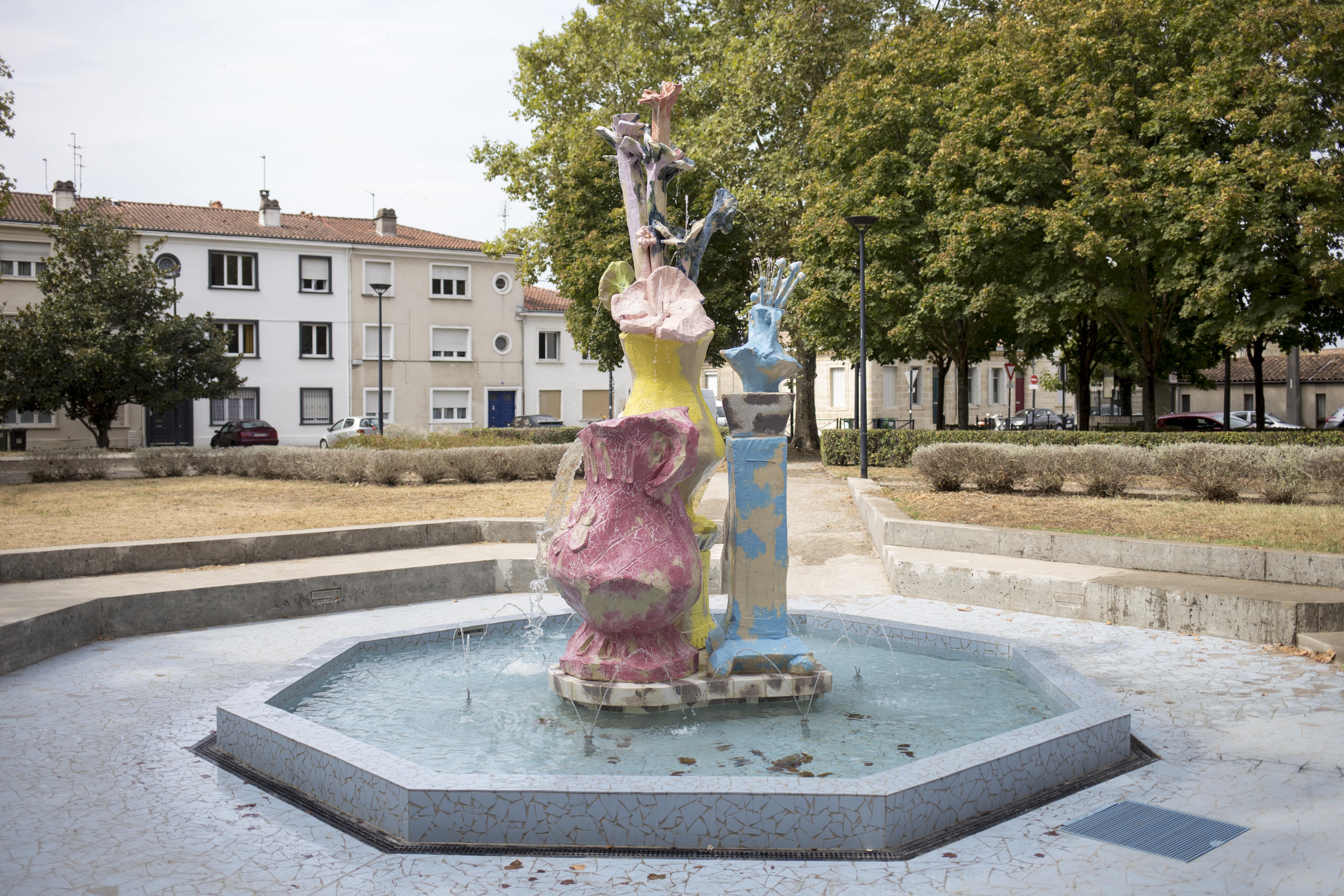 LES FONTAINES DE BACALAN – Clémence VAN LUNEN | Bordeaux, Place Adolphe Buscaillet – 2018 Ces deux sculptures-fontaines en céramique contemporaine font référence à l'histoire de la faïencerie Vieillard dans ce quartier de la ville. L’artiste Clémence van Lunen a réutilisé et détourné les codes et thèmes de nombreuses fontaines classiques de façon ludique. Dans une explosion de couleurs enfantines, elle a ramené l’eau et la joie sur la place Buscaillet. ©JB Mengès-Bordeaux Métropole |