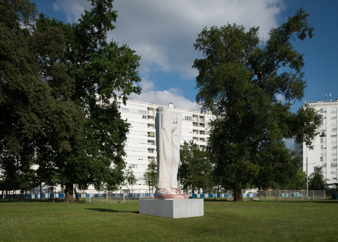 PANTALON DE JOGGING ET MOCASSINS À PAMPILLES – Daniel DEWAR et Grégory GICQUEL | Mérignac, Station Pin Galant, tramway ligne A – 2014 Tout est dans le titre. Des jambes de quatre mètres de haut assemblent deux éléments vestimentaires d’un style contradictoire, mais que tous peuvent reconnaitre. Cette sculpture de Dewar & Gicquel montre le rôle de la mode dans la quête identitaire qui se joue dans l’espace public. Elle réinterprète avec humour les codes et matériaux de la statuaire classique. ©Anne Leroy pour Bordeaux Métropole |
