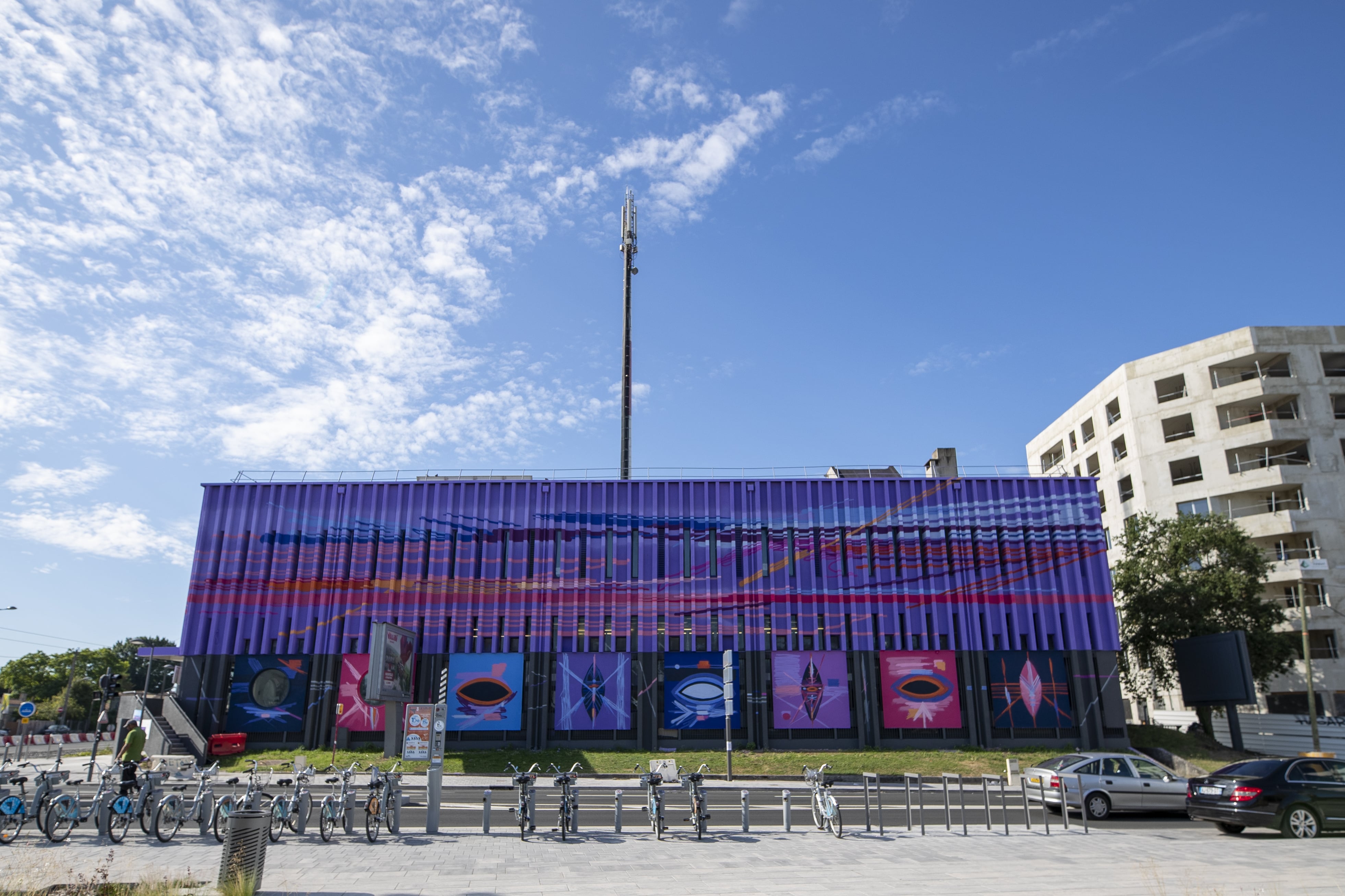 TRAITS D’UNION – Stéphane CARRICONDO | Villenave d’Ornon, Station Villenave - Centre Pont de la Maye, tramway ligne C – 2019 Dans une superposition de lignes délayées, cette fresque monumentale de Stéphane Carricondo joue avec les perspectives. Les tonalités d’un coucher de soleil se fondent dans le paysage en un dégradé progressif, comme une fenêtre sur l’horizon. Une frise de motifs primitifs vibrants et protecteurs invite à méditer sur notre rapport au monde et à l’autre. ©JB Mengès-Bordeaux Métropole |