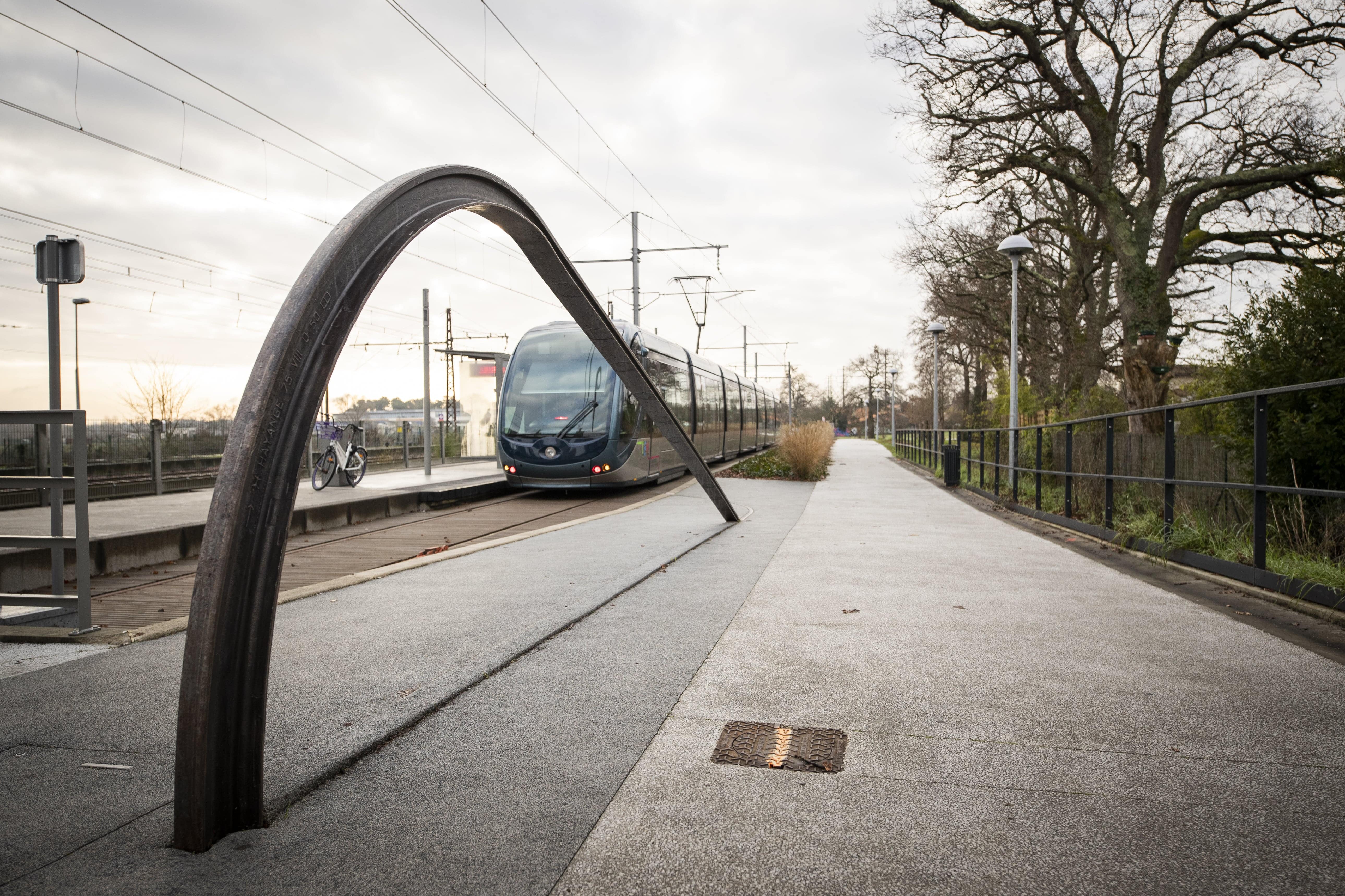 TRAVERSÉE – Cécile BEAU et Nicolas MONTGERMONT Cécile Beau et Nicolas Montgermont ont dessiné un rail qui part de la ligne de tramway et serpente au sol, s’élève jusqu’à hauteur d’oreille puis replonge dans le sol. Il permet d’écouter, comme dans les westerns, les vibrations provoquées par la circulation des wagons et qui se propagent dans le rail. Le temps d’attente devient une expérience sensible. ©JB Mengès-Bordeaux Métropole |