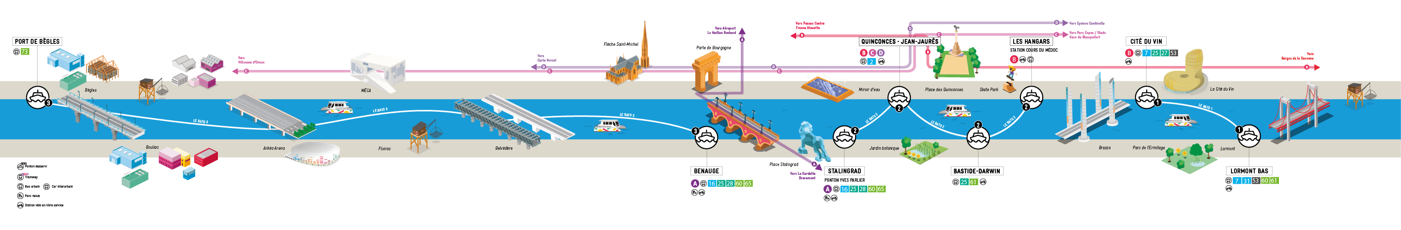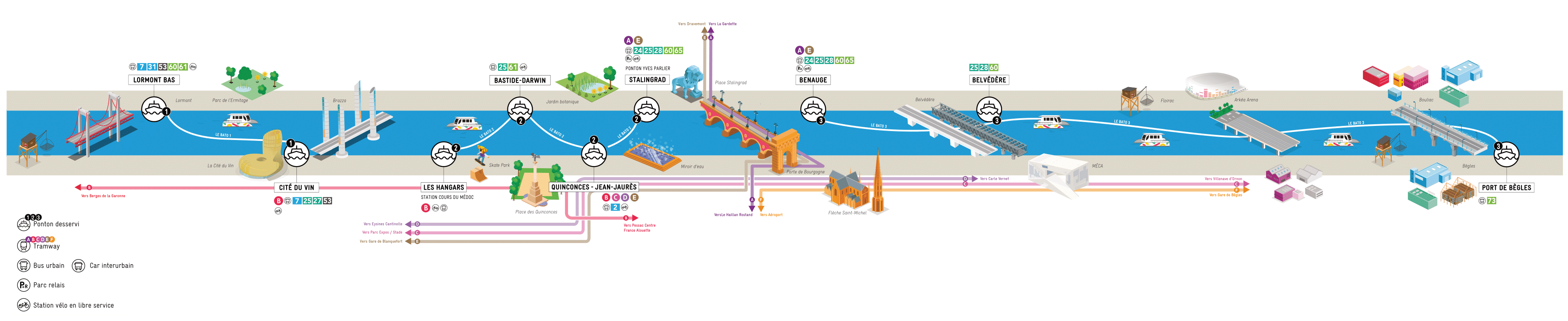 9 pontons desservis en fonction des lignes : LORMONT BAS et CITÉ DU VIN, LES HANGARS, BASTIDE-DARWIN, QUINCONCES-JEAN-JAURÈS et STALINGRAD, BENAUGE, BELVEDÈRE et PORT DE BÈGLES et de multiples connexions.