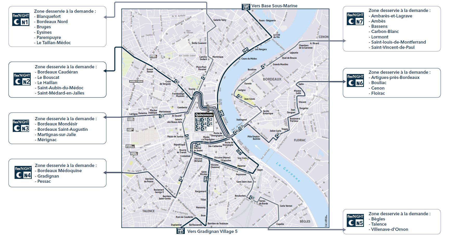 Les sept bus Flex’NIGHT desserviront chacun une sélection d’arrêts d’une zone de l’agglomération et assureront 2 départs depuis la place des Quinconces : l’un à 2h et l’autre à 4h du matin.