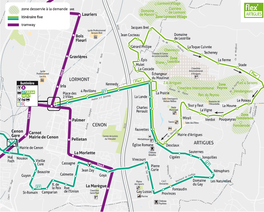 La ligne flex'Artigues se substitue aux lignes 64/66/67, le samedi, le dimanche et les jours fériés. Elle propose une connexion à Buttinière en correspondance avec les Tram A et E. Elle dessert également le quartier Grand Tressan de Lormont.