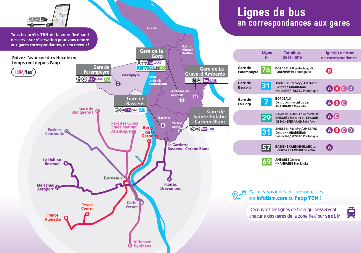 - Entre les arrêts TBM d'Ambès, Saint-Louis-de-Montferrand, Ambarès-et-Lagrave, Saint-Vincent-de-Paul, Bassens et Carbon-Blanc et les gares de la presqu'ile (Bassens, Sainte-Eulalie/Carbon-Blanc, La Gorp et La Grave-d'Ambarès).