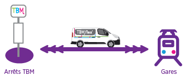 Tous les arrêts TBM de la zone flex' sont desservis sur réservation pour vous rendre aux gares correspondantes, ou en revenir ! Suivez l'avancée du véhicule en temps réel depuis l'app TBM flex' !