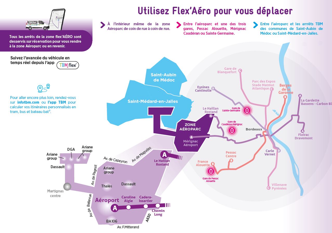 Tous les arrêts de la zone flex’AÉRO sont desservis sur réservation pour vous rendre à la zone Aéroparc ou en revenir. Suivez l'avancée du véhicule en temps réel depuis l'app TBM flex'.